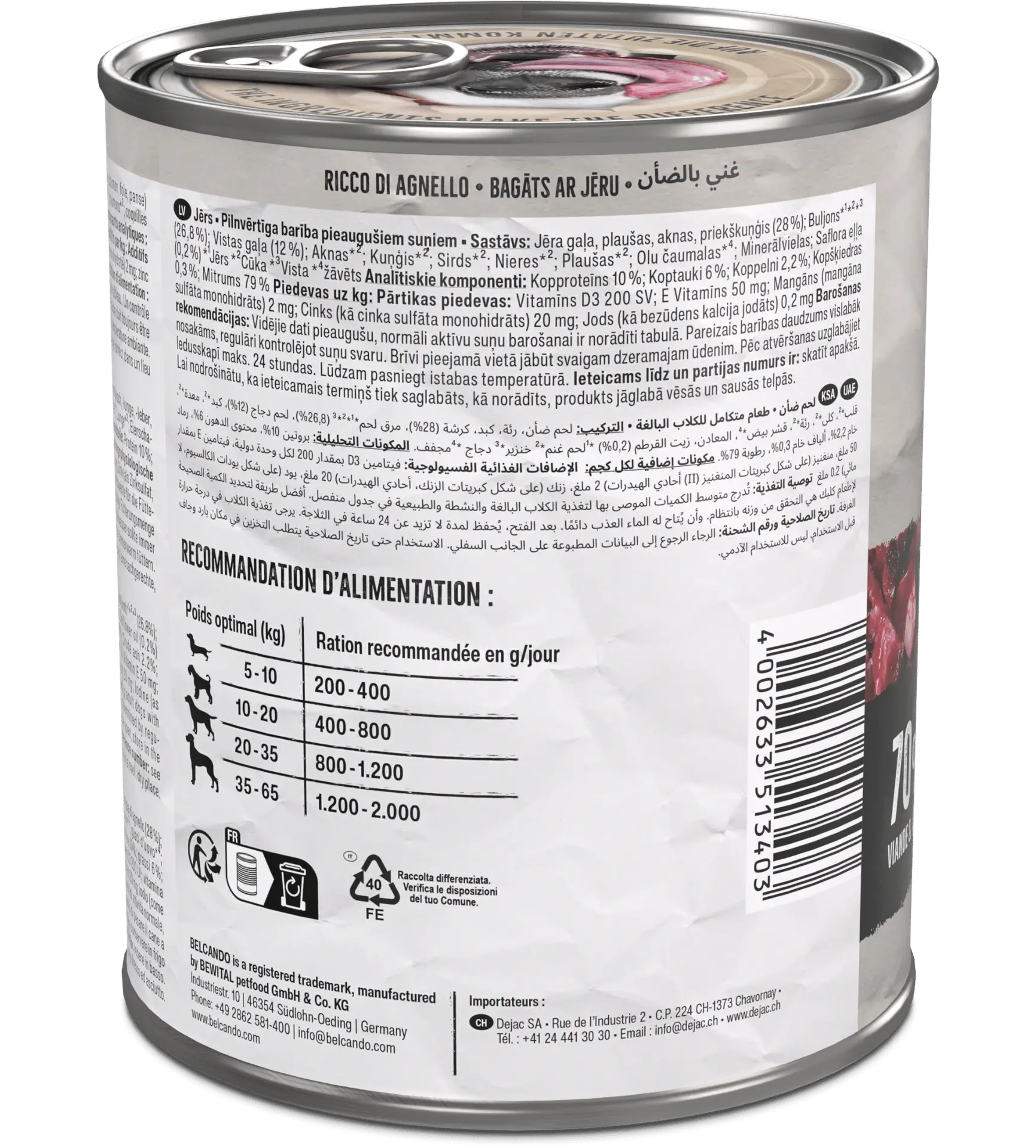 La boîte Belcando Baseline Agneau est une pâtée sans céréales pour chien adulte, riche en viande et abats d’agneau (26 %).