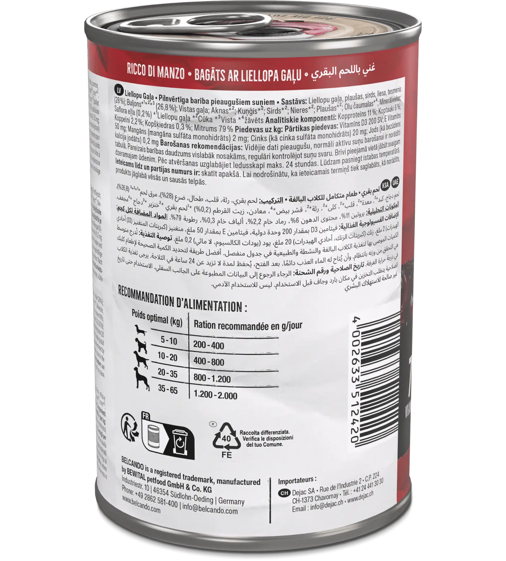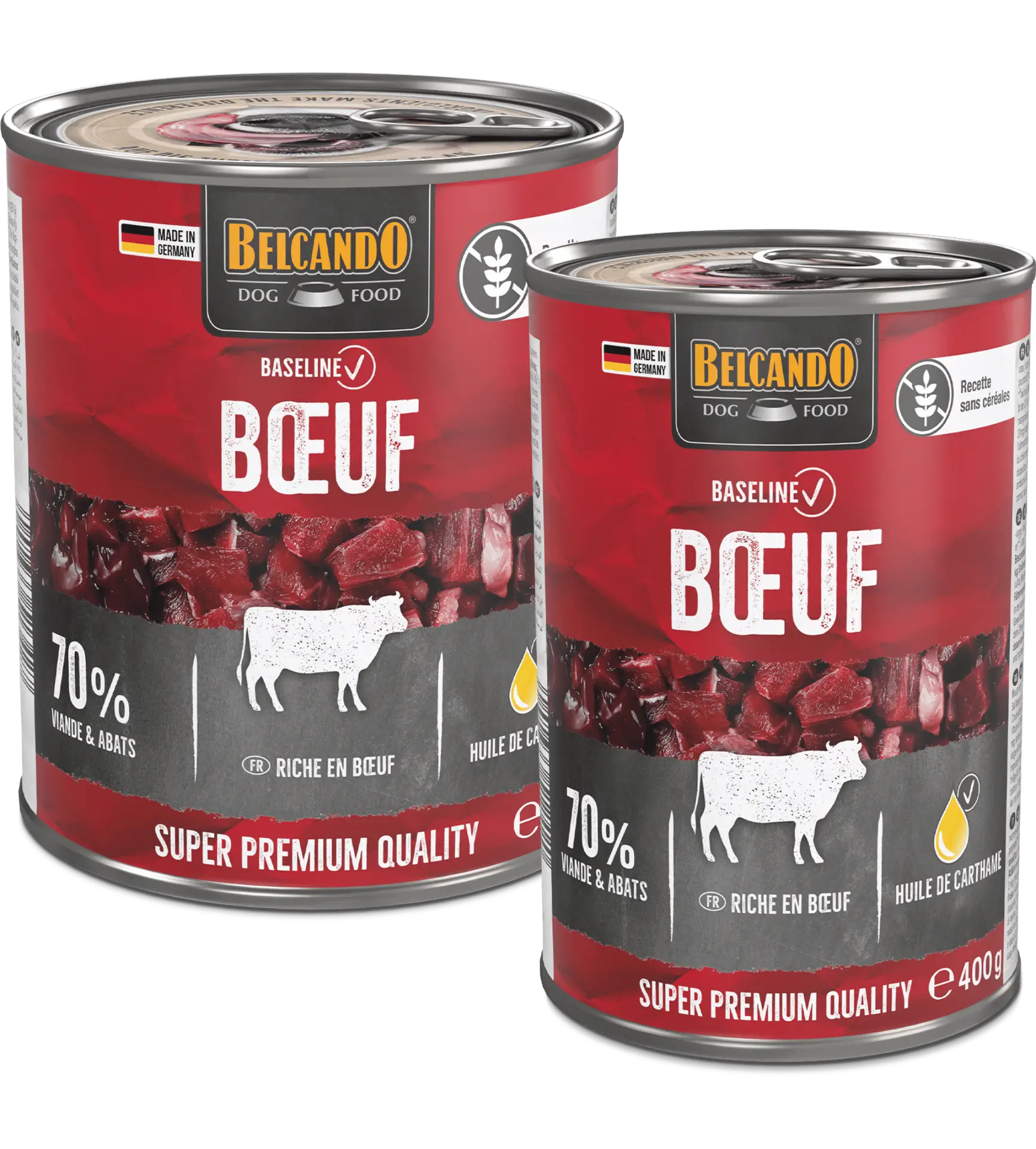 Achetez la boîte Belcando Baseline Bœuf, une pâtée humide sans céréales pour chien adulte à la recette riche en bœuf savoureux. Un aliment complet, équilibré et hautement digestible, disponible en 400 g et 800 g sur Eddie-Croquettes.com.