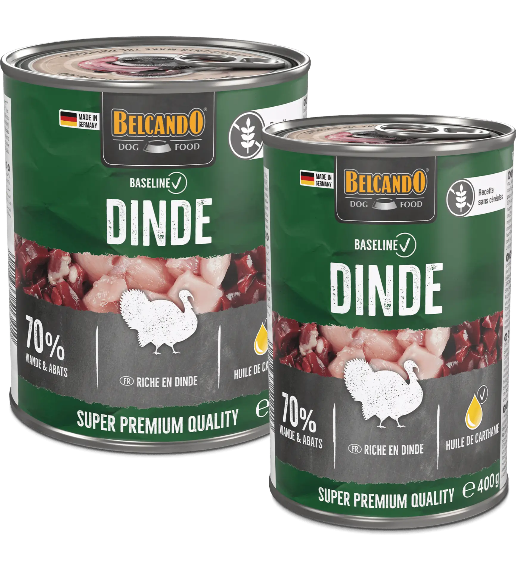 Achetez la boîte Belcando Baseline Dinde, une pâtée sans céréales pour chien adulte riche en viande de dinde. Un aliment complet, savoureux et hautement digestible, disponible en boîte 400 g et 800 g sur Eddie-Croquettes.com.