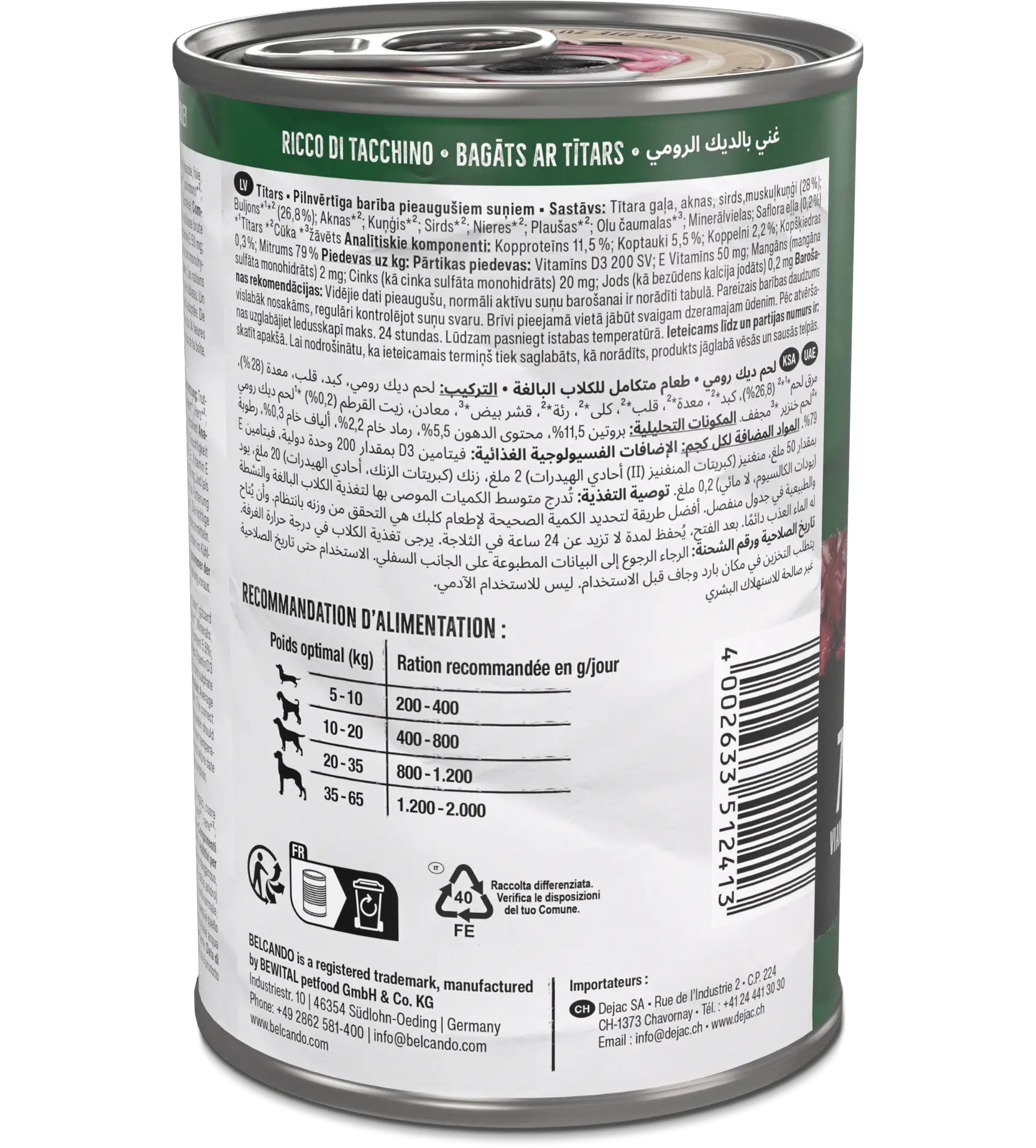 La boîte Belcando Baseline Dinde est une pâtée sans céréales pour chien adulte, riche en viande et abats de dinde (28 %).