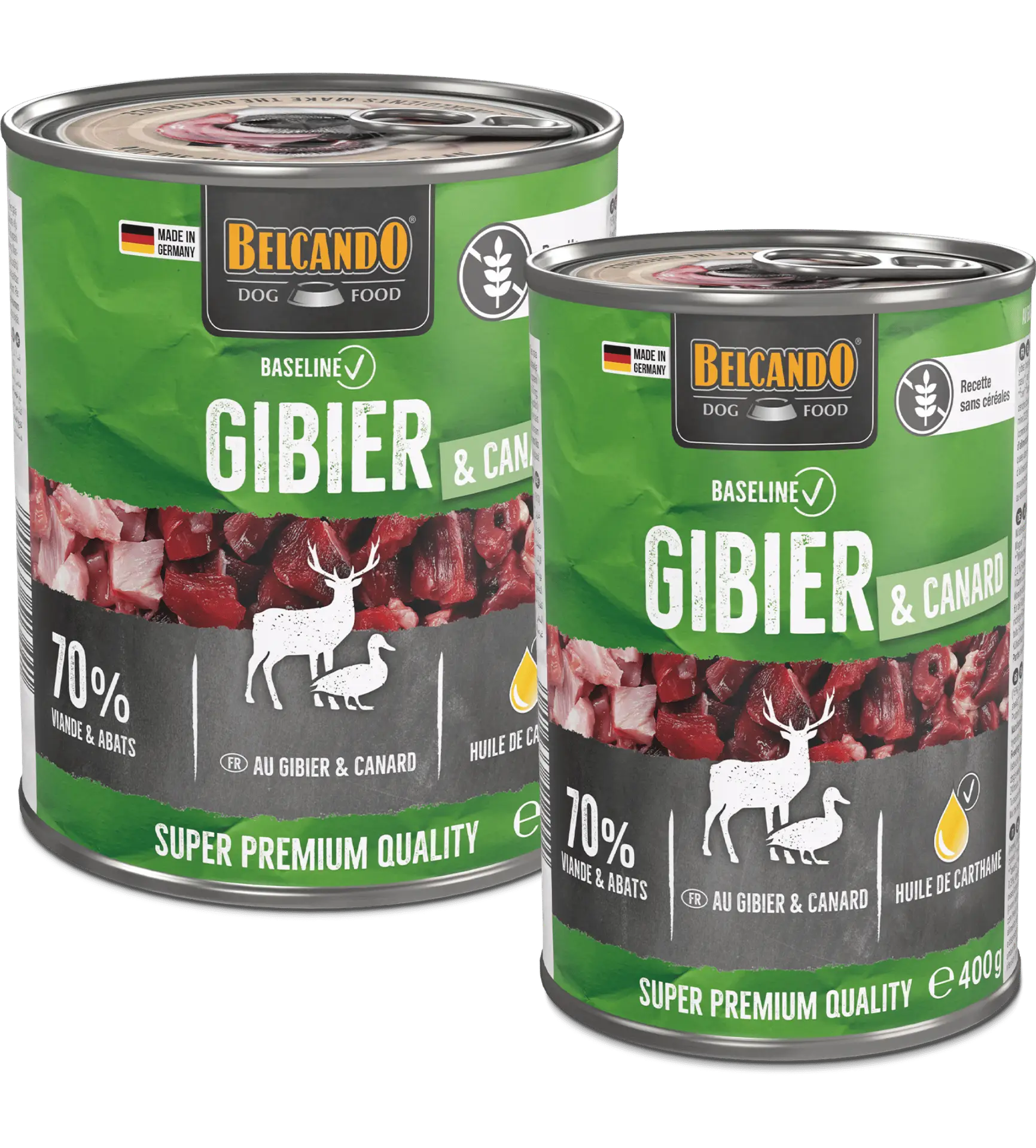 Achetez la boîte Belcando Baseline Gibier & Canard, une pâtée humide sans céréales pour chien adulte à la saveur prononcée de gibier et de canard. Un aliment complet, savoureux et hautement digestible, disponible en boîte 400 g et 800 g sur Eddie-Croquettes.com.
