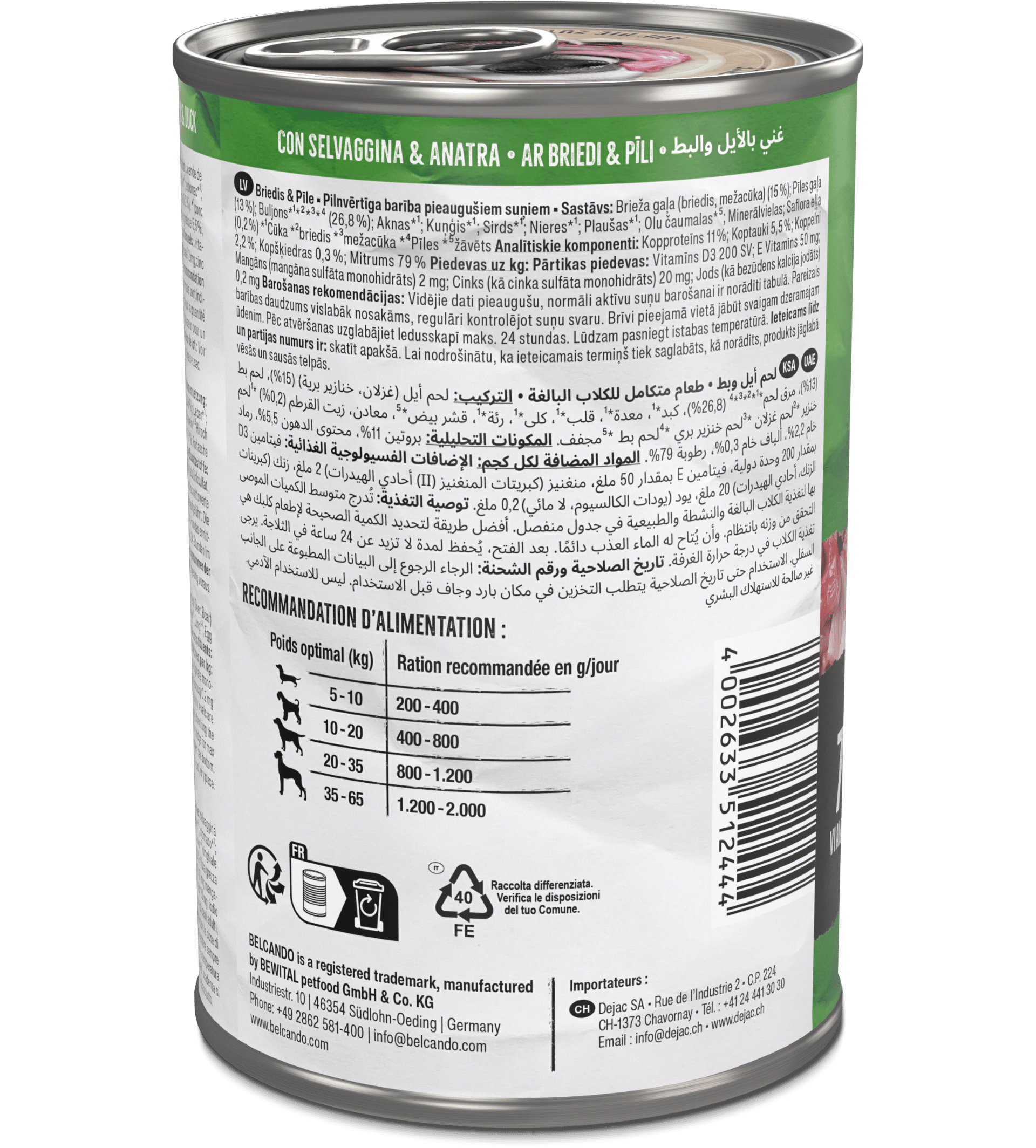 La boîte Belcando Baseline Gibier & Canard est une pâtée sans céréales pour chien adulte, riche en viande et abats de gibier et canard.