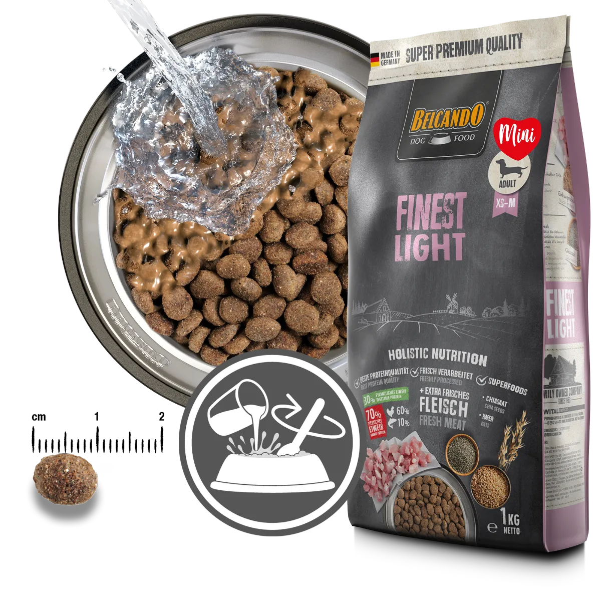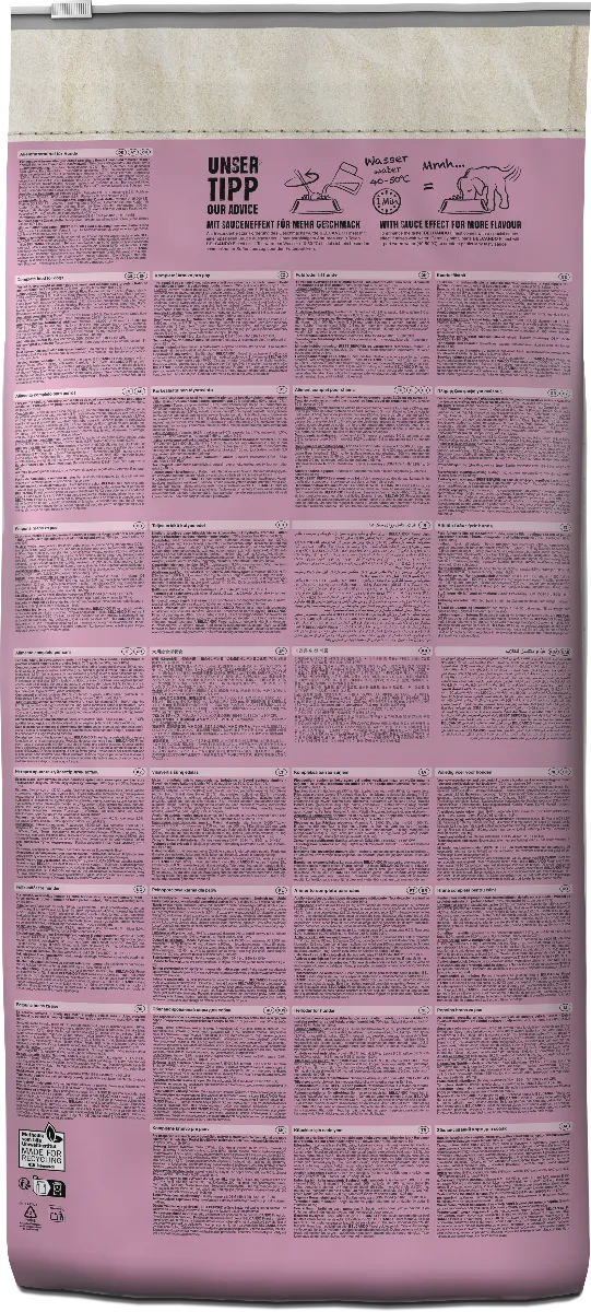Cette recette convient également très bien aux chiens difficiles : en ajoutant un peu d’eau tiède, les croquettes se couvrent d’une sauce savoureuse qui incite même les gourmets les plus exigeants à manger avec appétit