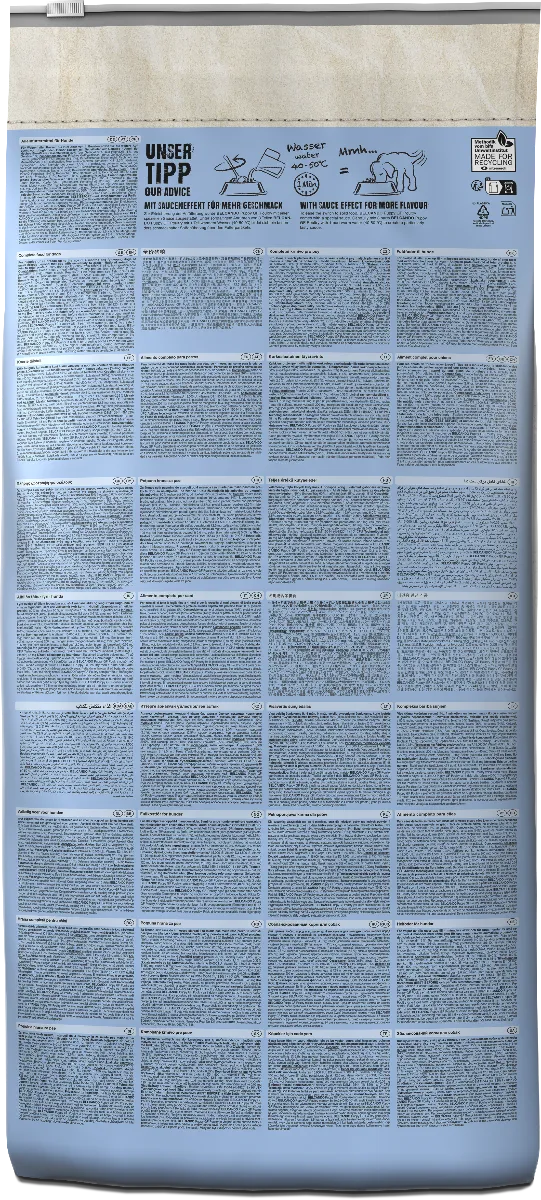 Le taux de protéines animales par rapport au taux global de protéines est de 80 % (volaille 60 %, poissons 15 %, gélatine 5 %)