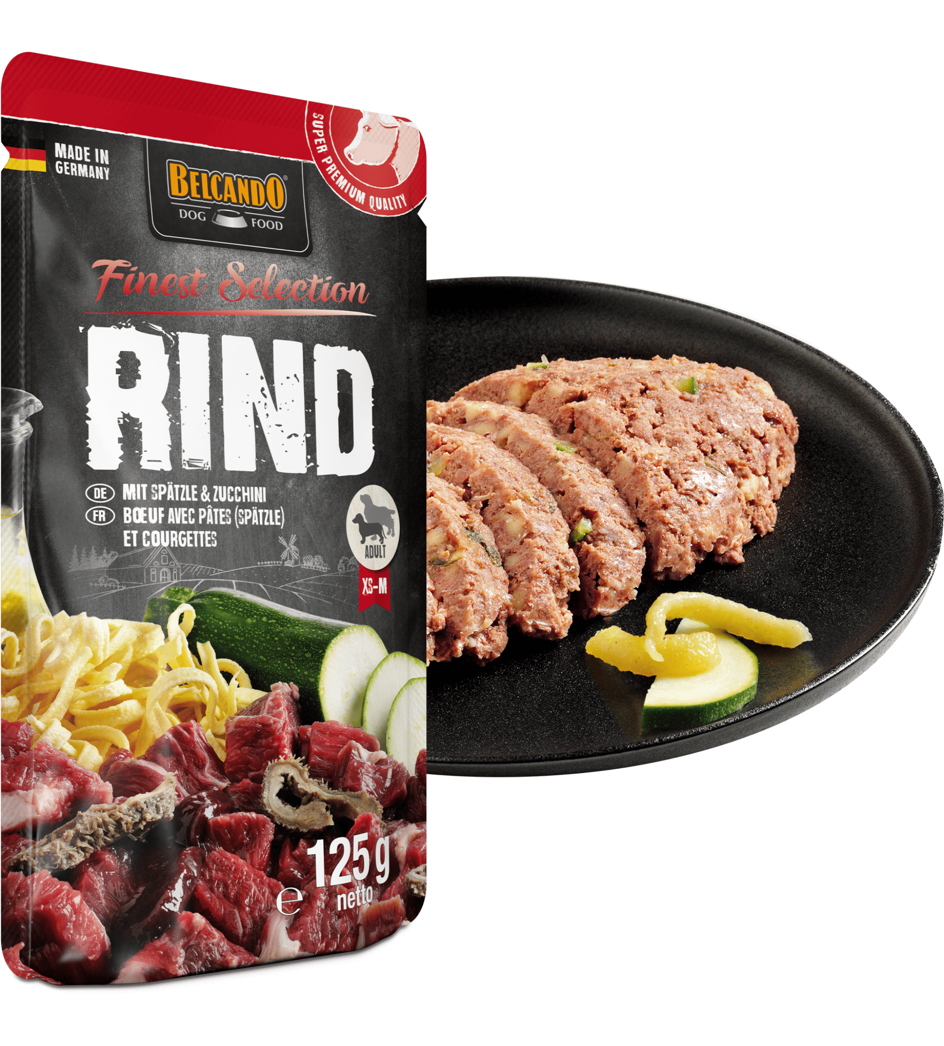 Le Belcando Sachet Fraîcheur Bœuf avec pâtes spaetzle et courgettes est un aliment complet pour chiens adultes :