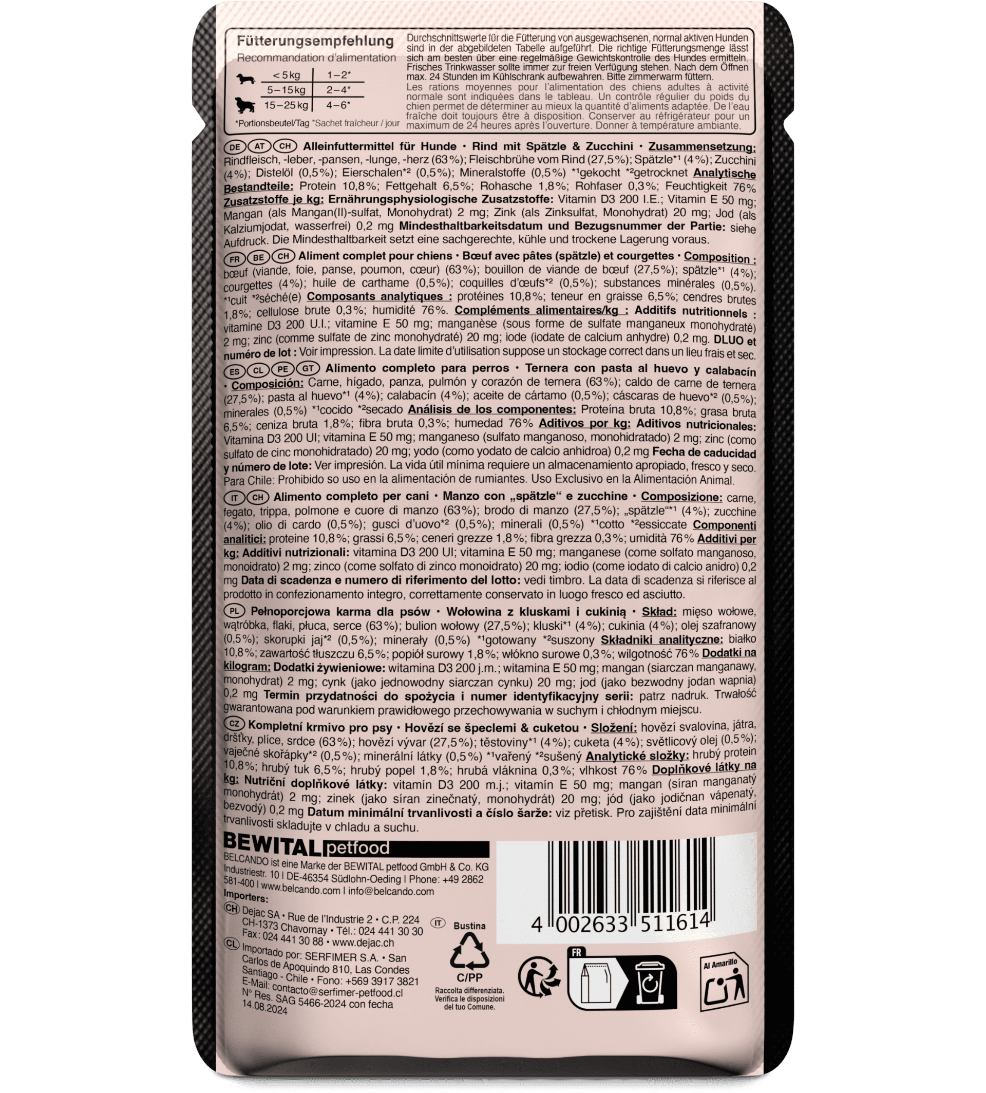 Le Belcando Sachet Fraîcheur Bœuf avec pâtes spaetzle et courgettes convient parfaitement aux chiens adultes de toutes races.