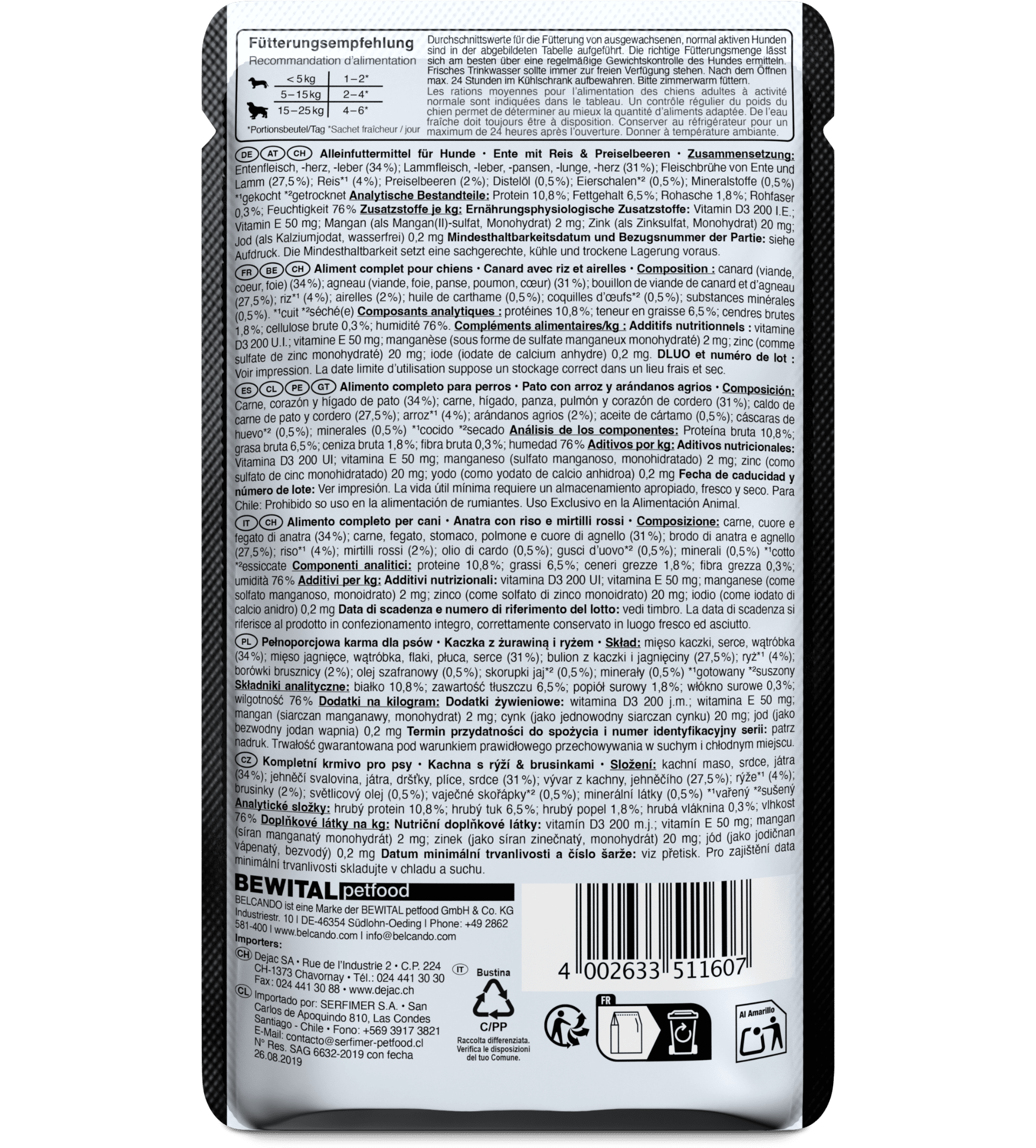 Le Belcando Sachet Fraîcheur Canard avec riz et airelles convient parfaitement aux chiens adultes de toutes races.