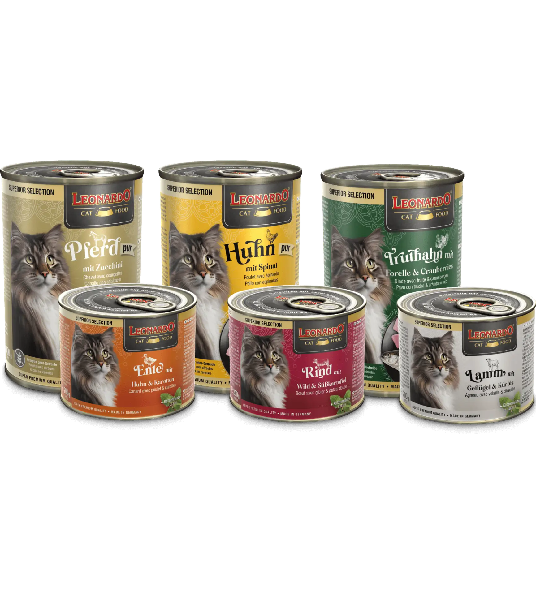 Poulet & épinards : poulet (viande, cœur, foi, gésier) (69 %); bouillon de viande de poulet (28,8 %); épinards (1 %); substances minérales (0,5 %); coquilles d’œufs (0,5 %); huile de saumon (0,1 %); cataire (0,1 %) séché(e)