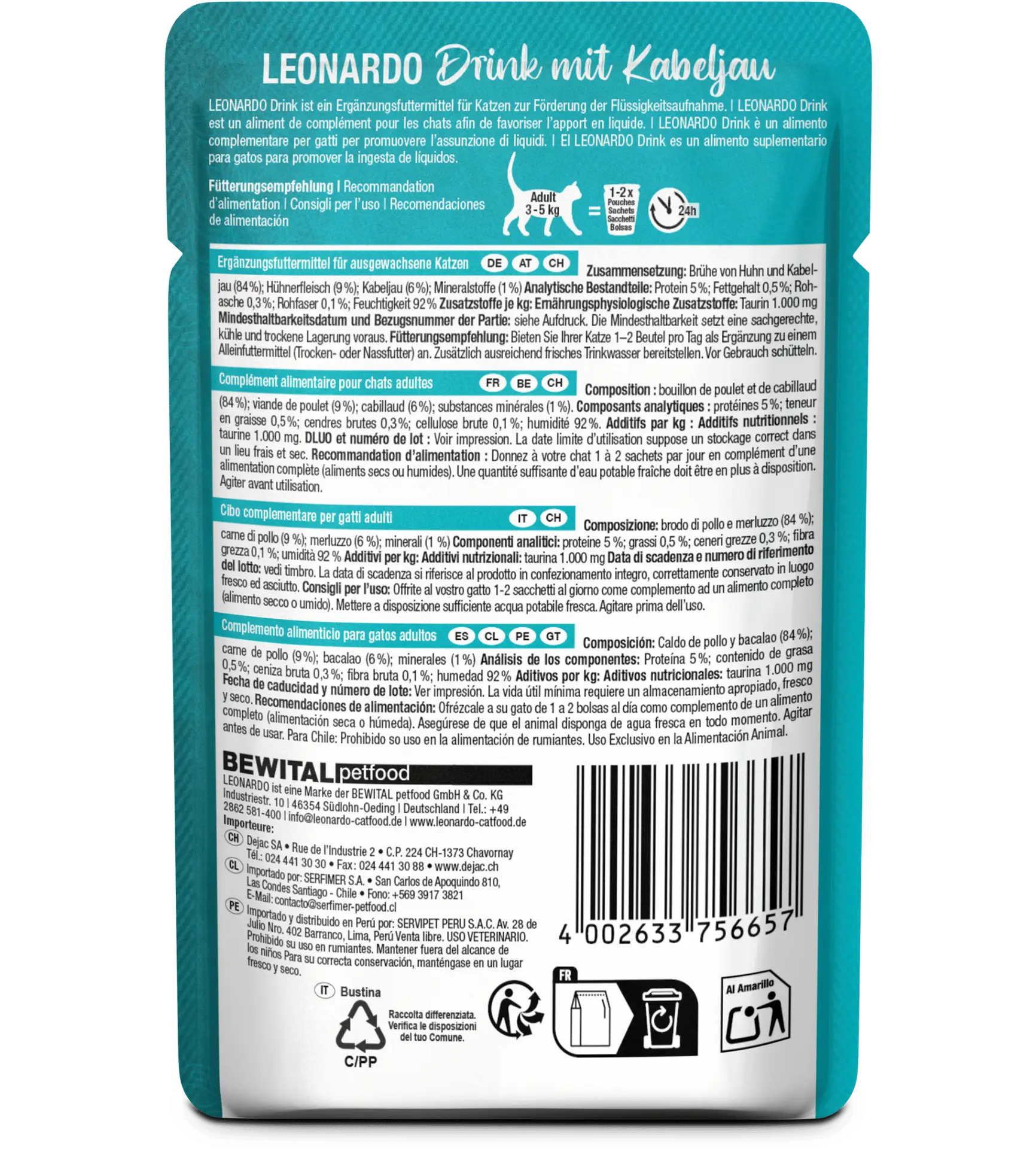 Fabriqué en Allemagne par Leonardo, marque reconnue pour ses recettes premium sans compromis, ce complément alimentaire apporte qualité, digestibilité et plaisir gustatif dans chaque sachet.