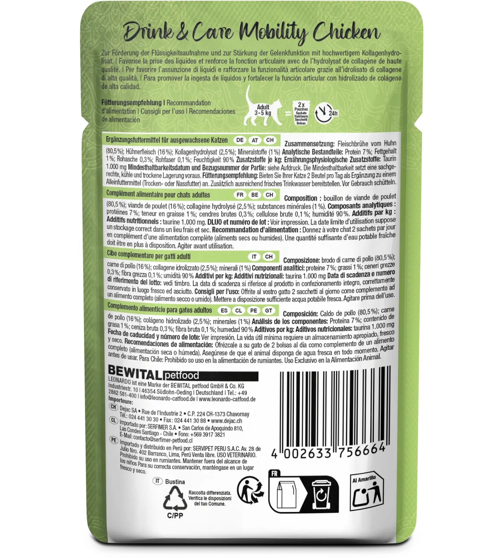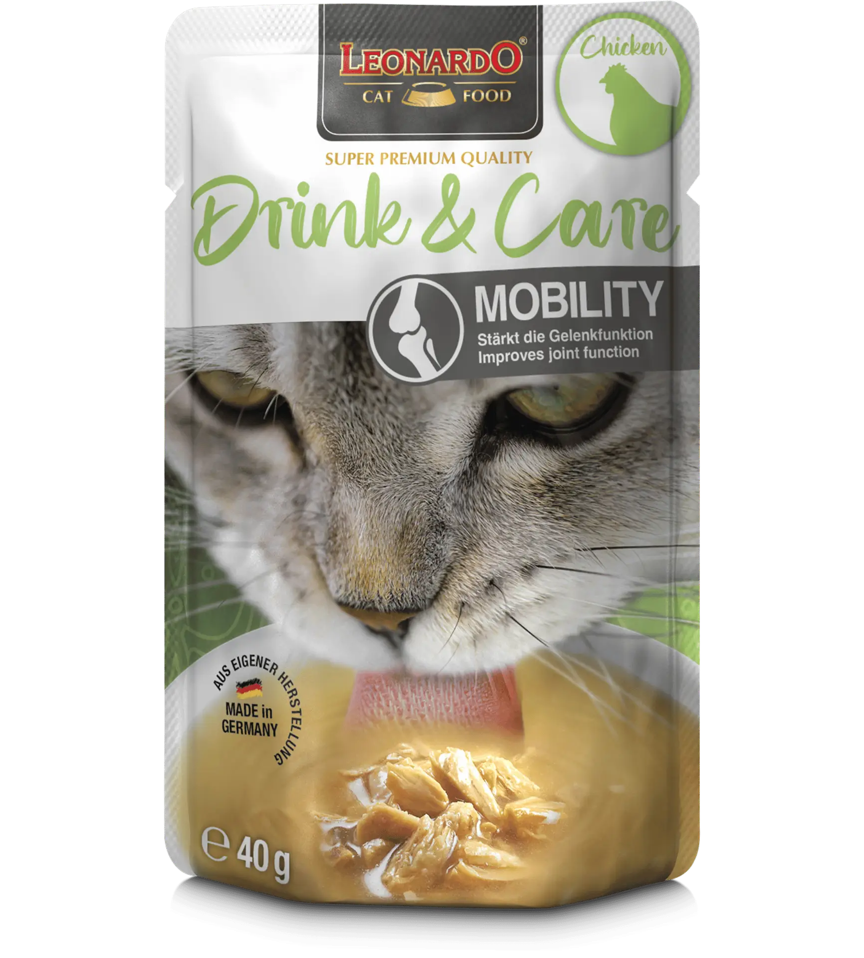 Idéale pour les chats seniors, actifs ou nourris aux croquettes, cette boisson hautement appétente au poulet associe plaisir, hydratation et soutien articulaire dans une recette premium fabriquée en Allemagne.