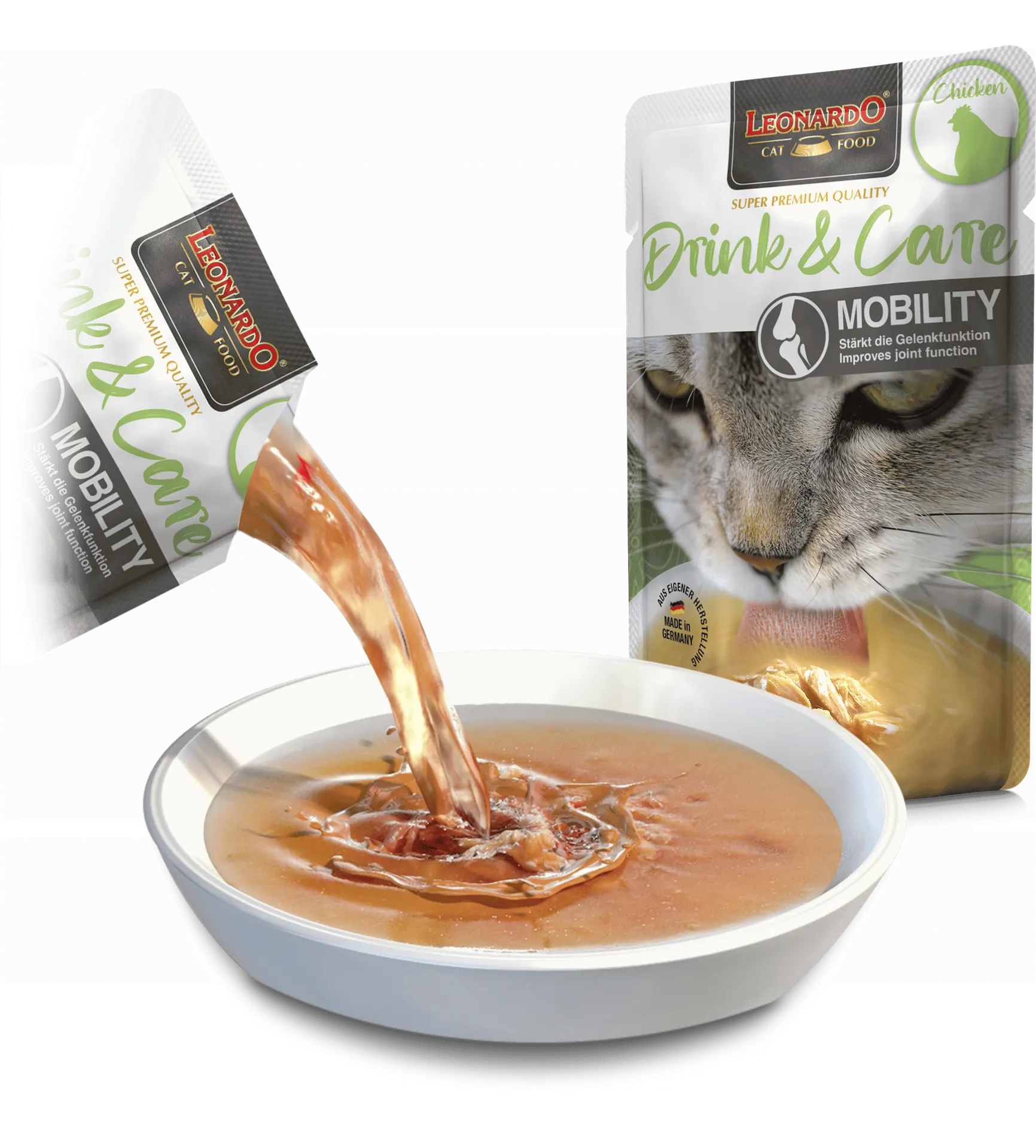 Leonardo Drink & Care Mobility est la solution idéale pour hydrater votre chat tout en soutenant naturellement ses articulations et sa mobilité.