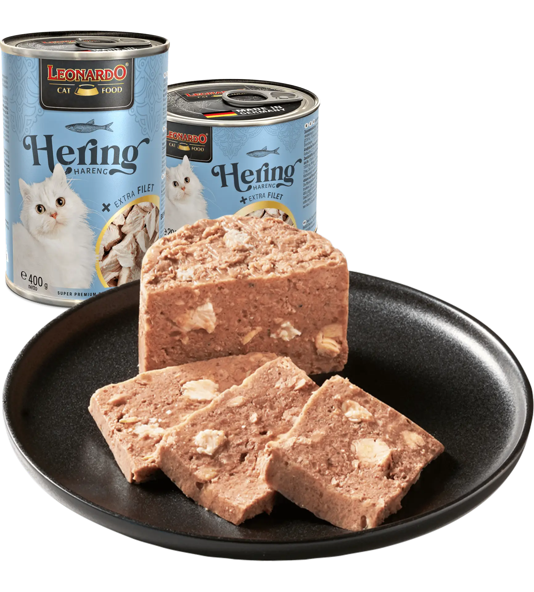 Leonardo Hareng + Filet Extra est une pâtée premium sans céréales pour chat adulte, riche en hareng savoureux et en morceaux de filet de dinde. Hautement appétente et riche en acides gras essentiels, elle contribue à une peau saine, un pelage brillant et une alimentation complète et équilibrée, idéale pour les chats exigeants ou amateurs de poisson.