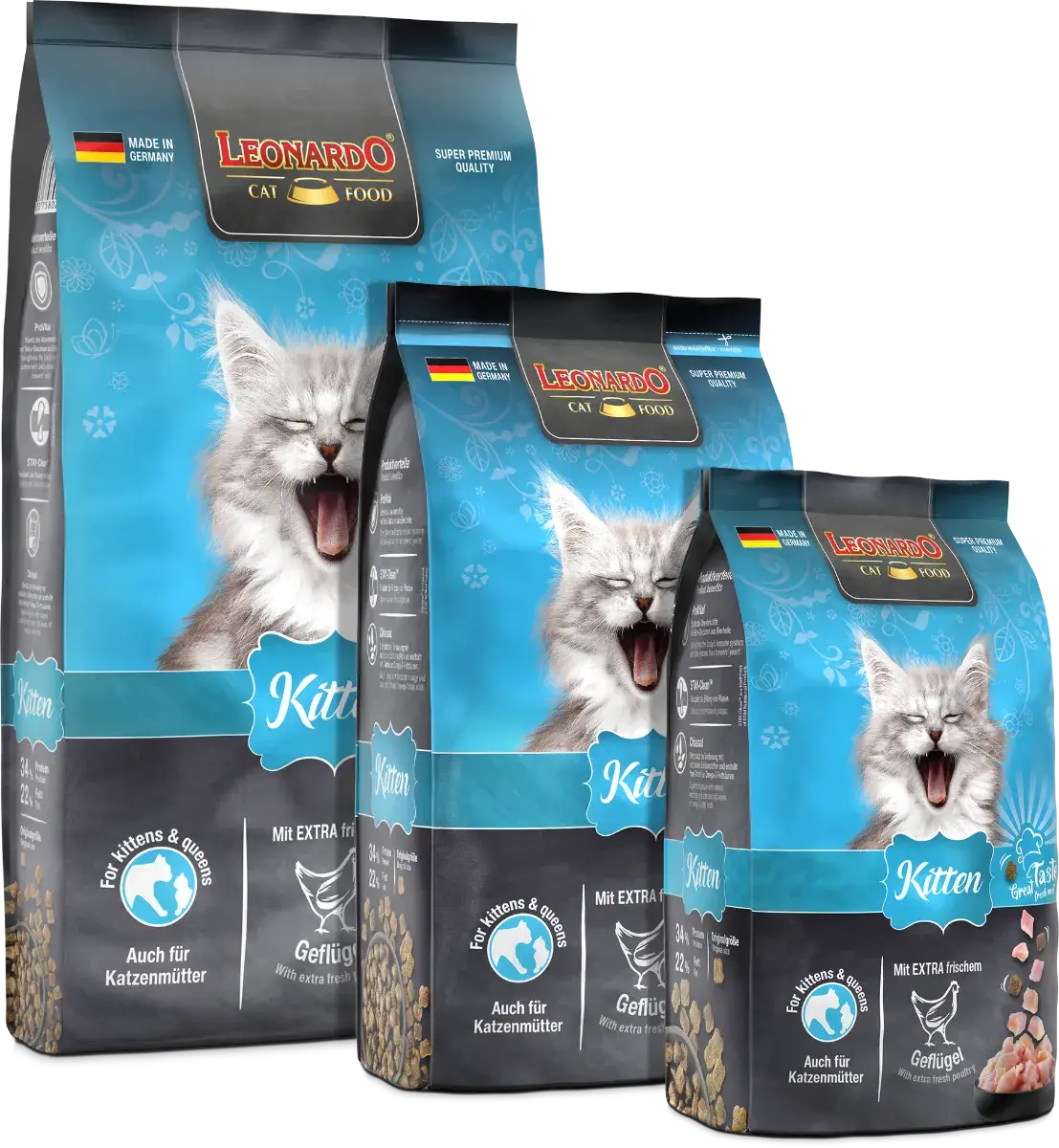 Leonardo Kitten convient aux chatons de toutes races jusqu’à un an et pour les chattes en gestation/lactation.