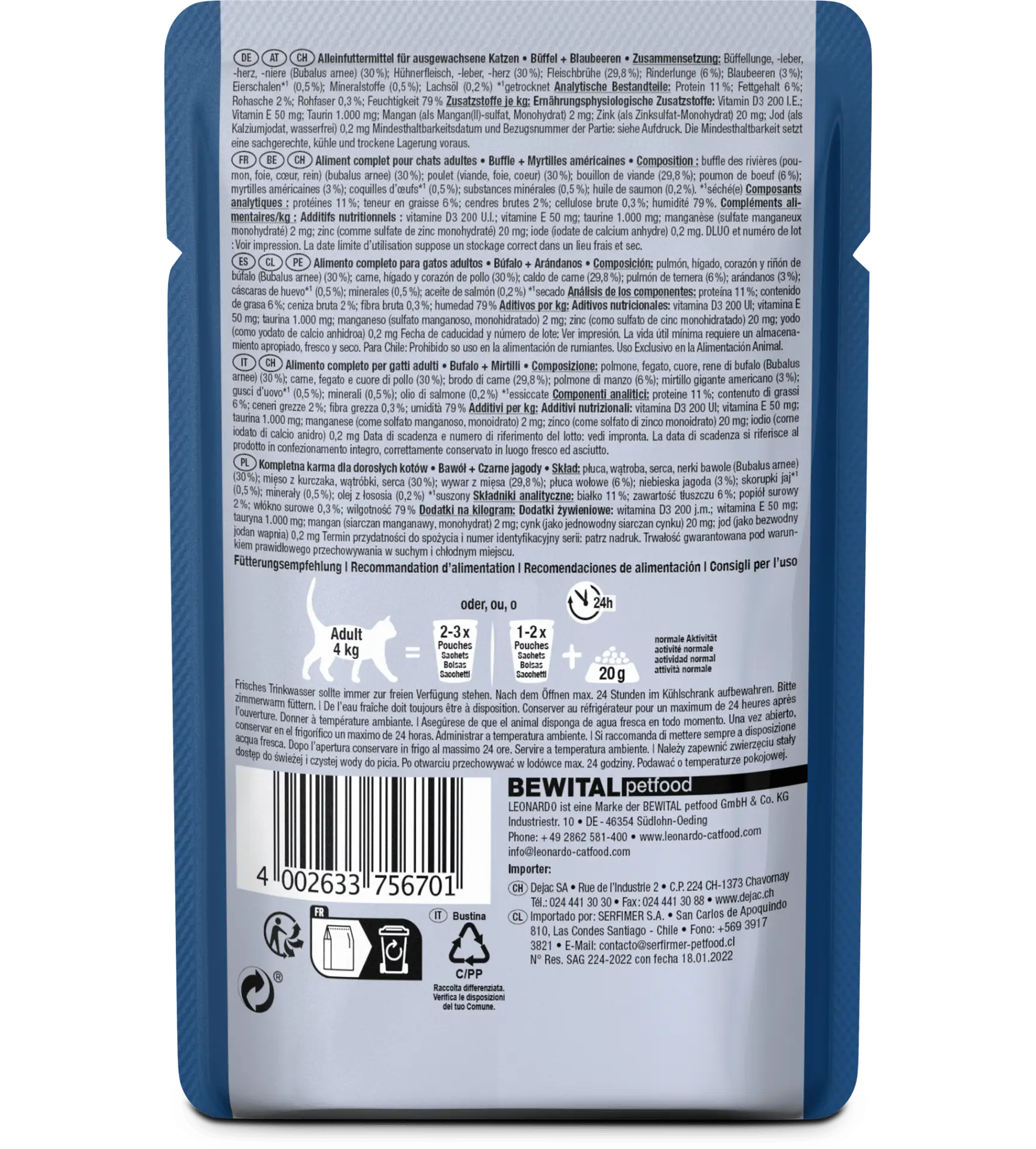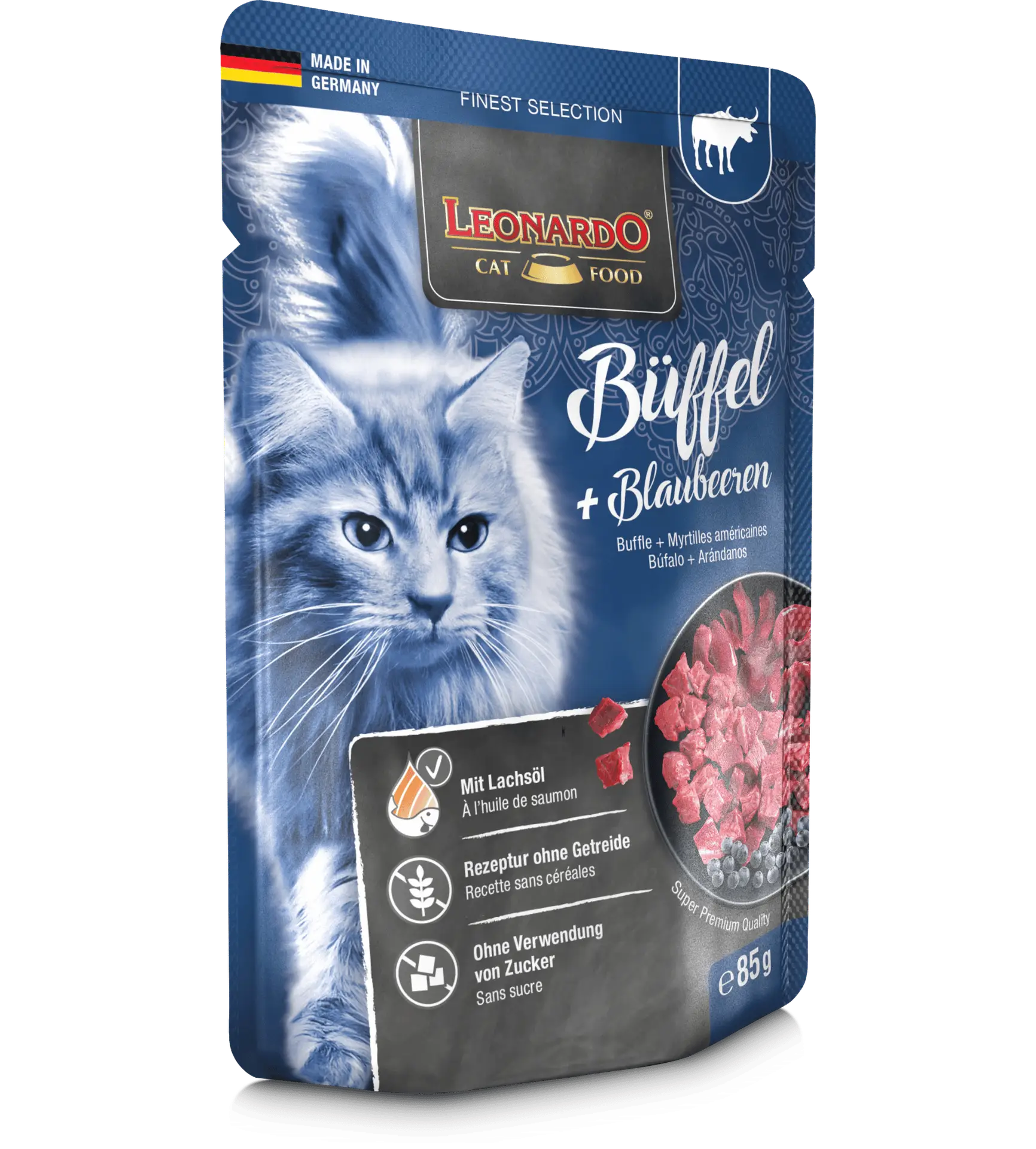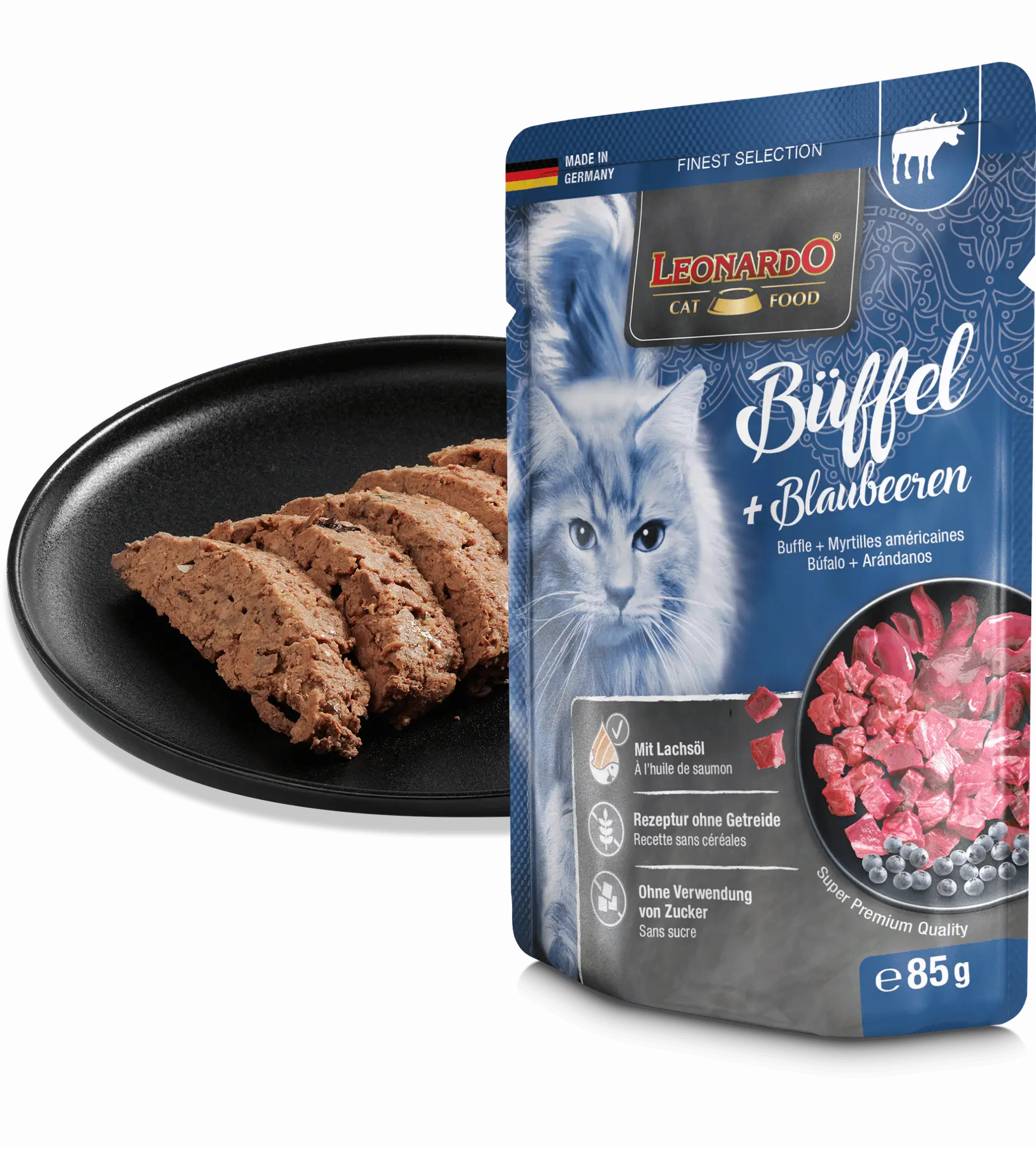 Leonardo Sachet Fraîcheur Buffle des Rivières + Myrtilles Américaines – Alimentation humide premium pour chat adulte