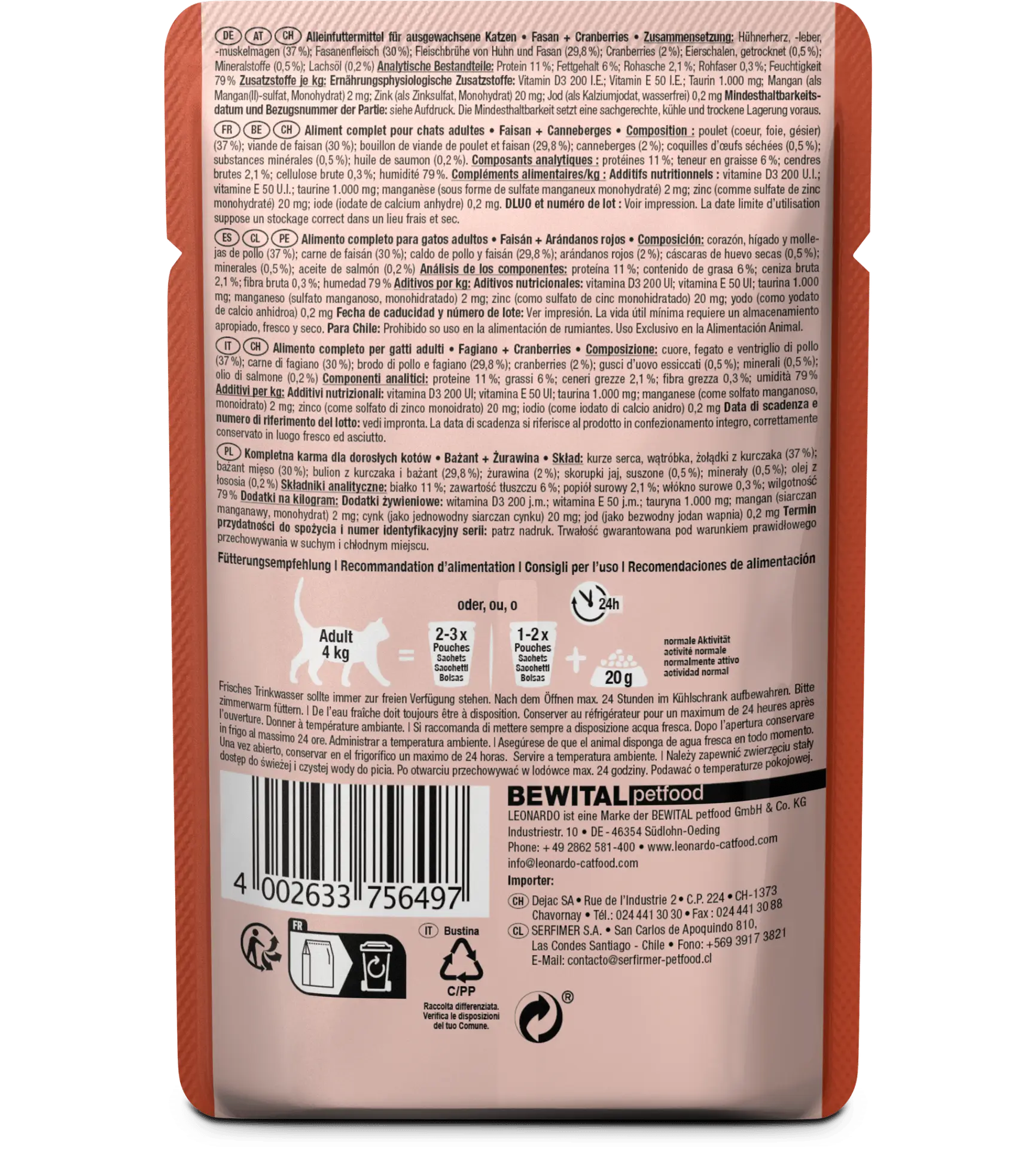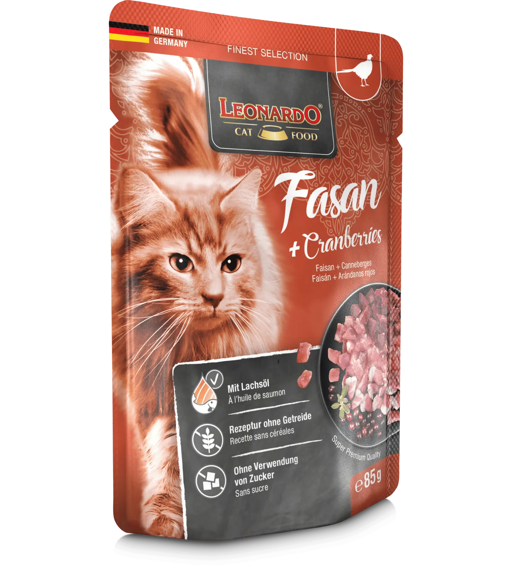 Le Leonardo Sachet Fraîcheur Faisan + Canneberges est conçu pour répondre aux besoins nutritionnels des chats adultes, quelle que soit leur activité.