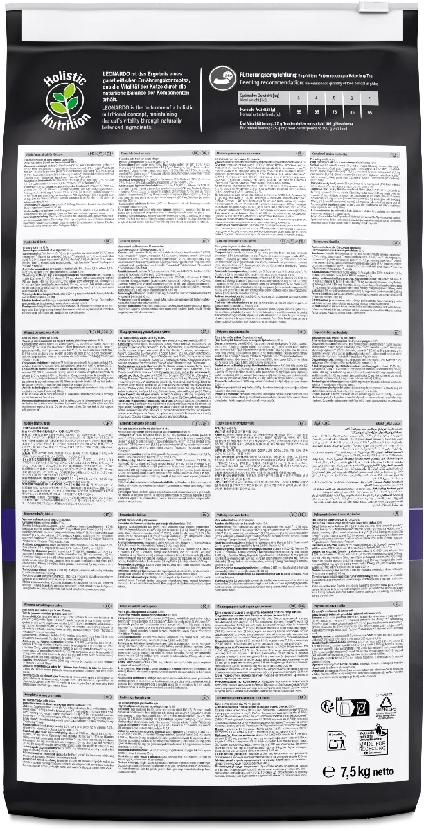 Grâce à des ingrédients soigneusement sélectionnés et hautement digestibles, Leonardo Senior permet de maintenir une alimentation saine et adaptée aux chats seniors, tout en conservant une excellente appétence.