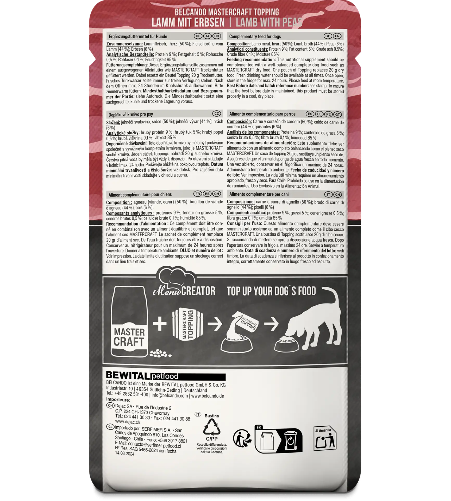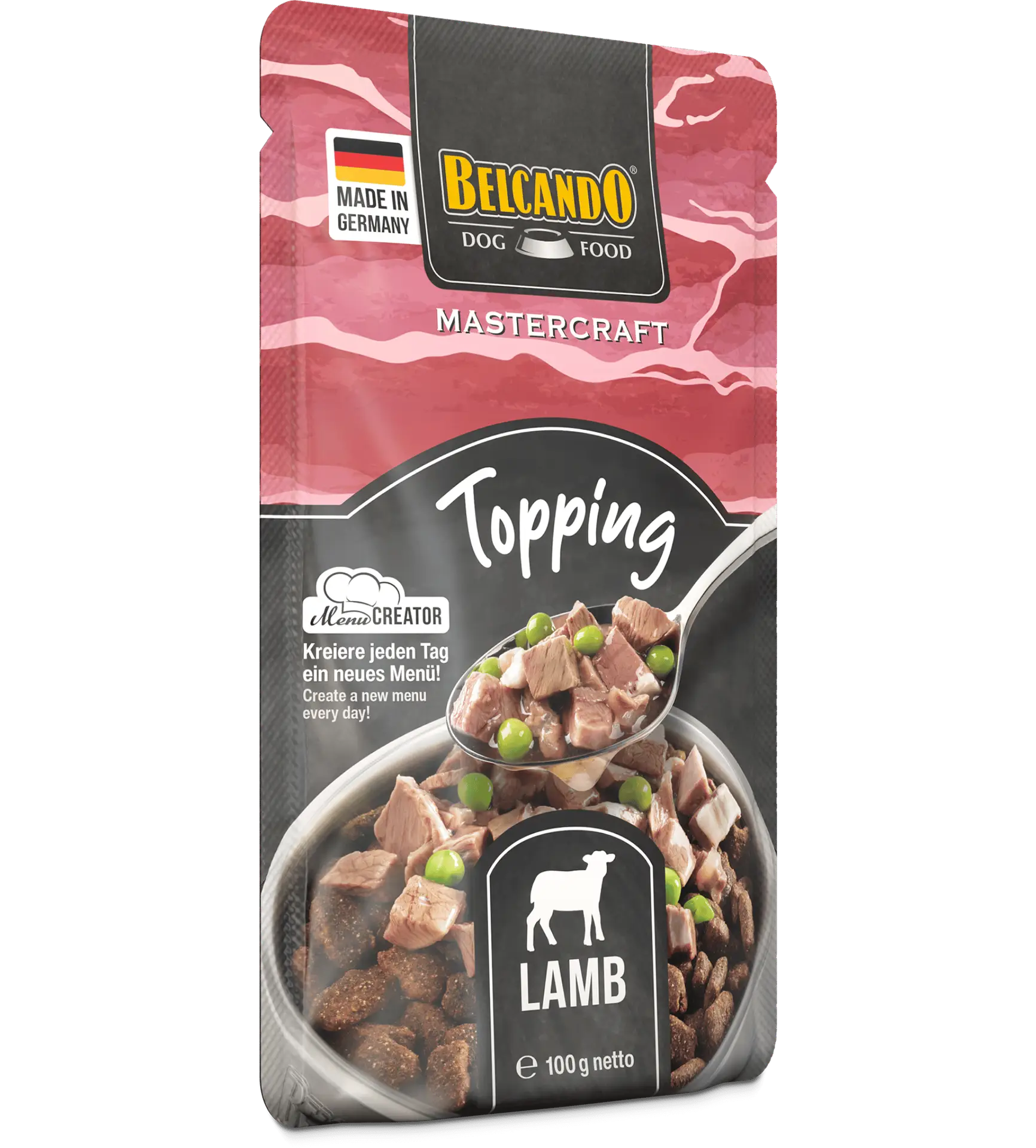 Le Belcando Mastercraft Topping Agneau avec petits pois convient parfaitement comme complément alimentaire pour chiens adultes de toutes tailles et races.